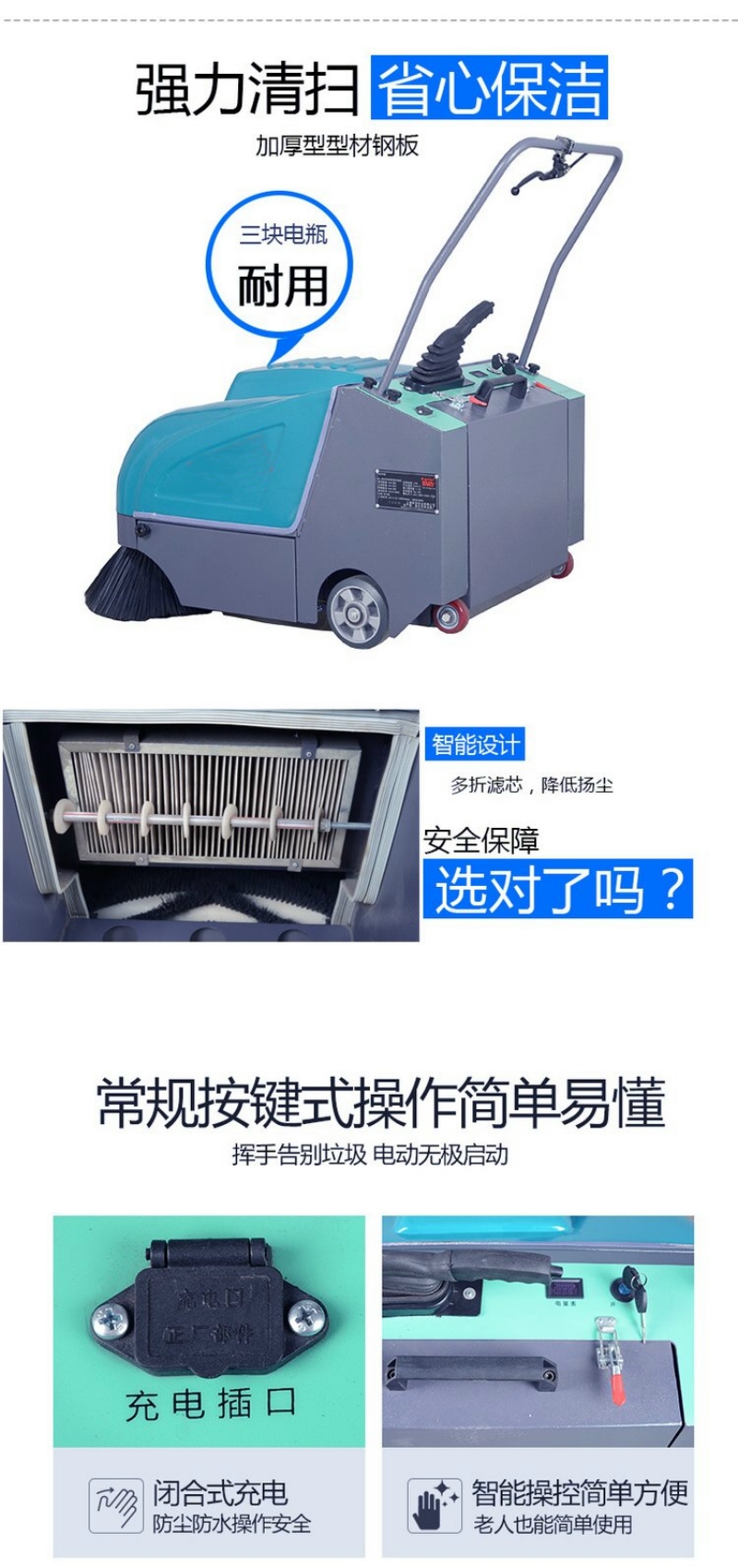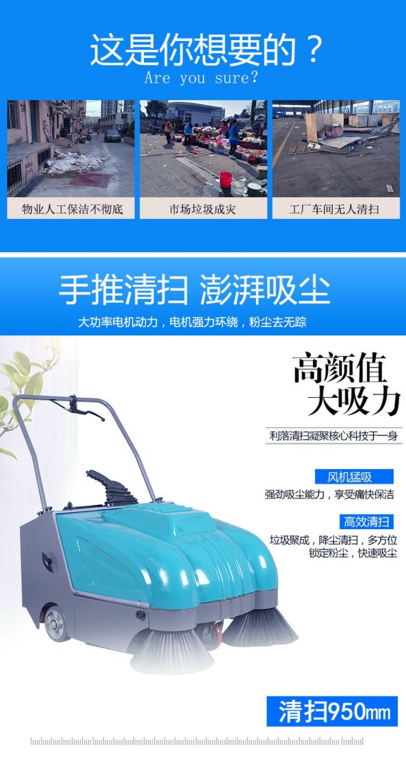 手推式扫地机的使用特性。手推式无动力扫地机无噪音、无尾气排放,手推驱动,省力方便。体积小,转弯灵活,易操作,维修方便;集扫、吸于一体,无二次污染,五二次扬尘。能满足绝大多数的清洁需求,特别适合于环卫街道、学校道路、物业小区等场所的使用。而手推式电瓶式扫地机,机械化作业效率高、效果好、清扫干净,避免人工清扫中中出现的尘土飞扬、尘灰难扫、漏扫现象。