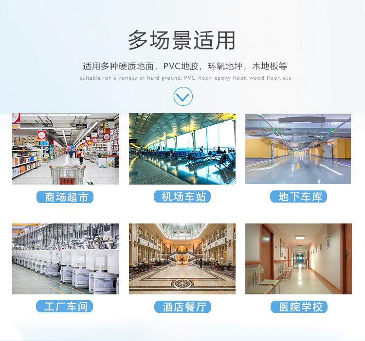 适用于瓷砖地面、镜面石料地面、环氧地面、PVC地面、金刚沙地面、磨光水泥地面等硬质地面的表面清洁,它的 和一尘不留的清洗模式,是任何人工操作所不能比的。适用于小型超市、写字楼、车间、场馆、商场、宾馆等拥有交流电源的清洁场所,是让中国清洁行业尽快进入使用机械做现场保洁的产品。
